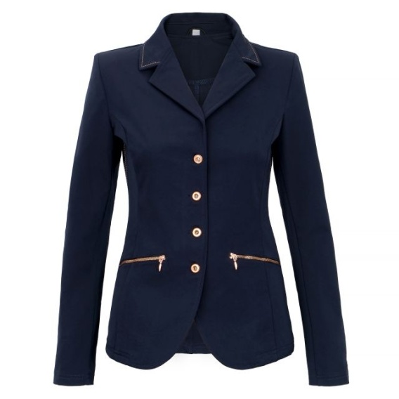 Elegancki frak, który przyciągnie spojrzenia sędziów i widzów w trakcie zawodów. Wykonany jest z lekkiego, elastycznego materiału, który świetnie dopasuje się do sylwetki. Uroku dodają mu piękne, błyszczące guziki w kolorze różowego złota z zatopionymi drobinkami brokatu. Wyjątkowy charakter fraku podkreślony jest przez przeszycia pod kolor guzików. Frak zapinany jest na zamek i guziki oraz zawiera dwie kieszenie z przodu zapinane na zamek. Dostępny jest w dwóch wariantach kolorystycznych, które pięknie komponują się z różowym złotem - granatowy oraz czarny.
