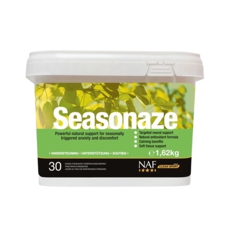 NAF Seasonaze to suplement wspierający dobrostan i redukcję sezonowego stresu u koni i kucy. Preparat został opracowany z myślą o zwierzętach wykazujących objawy sezonowego niepokoju, wynikającego m.in. z nasłonecznienia, pyłków roślinnych, wiatru lub innych czynników środowiskowych charakterystycznych dla określonych pór roku. Formuła wspomaga układ nerwowy, wzmacnia odporność i poprawia ogólne samopoczucie konia.